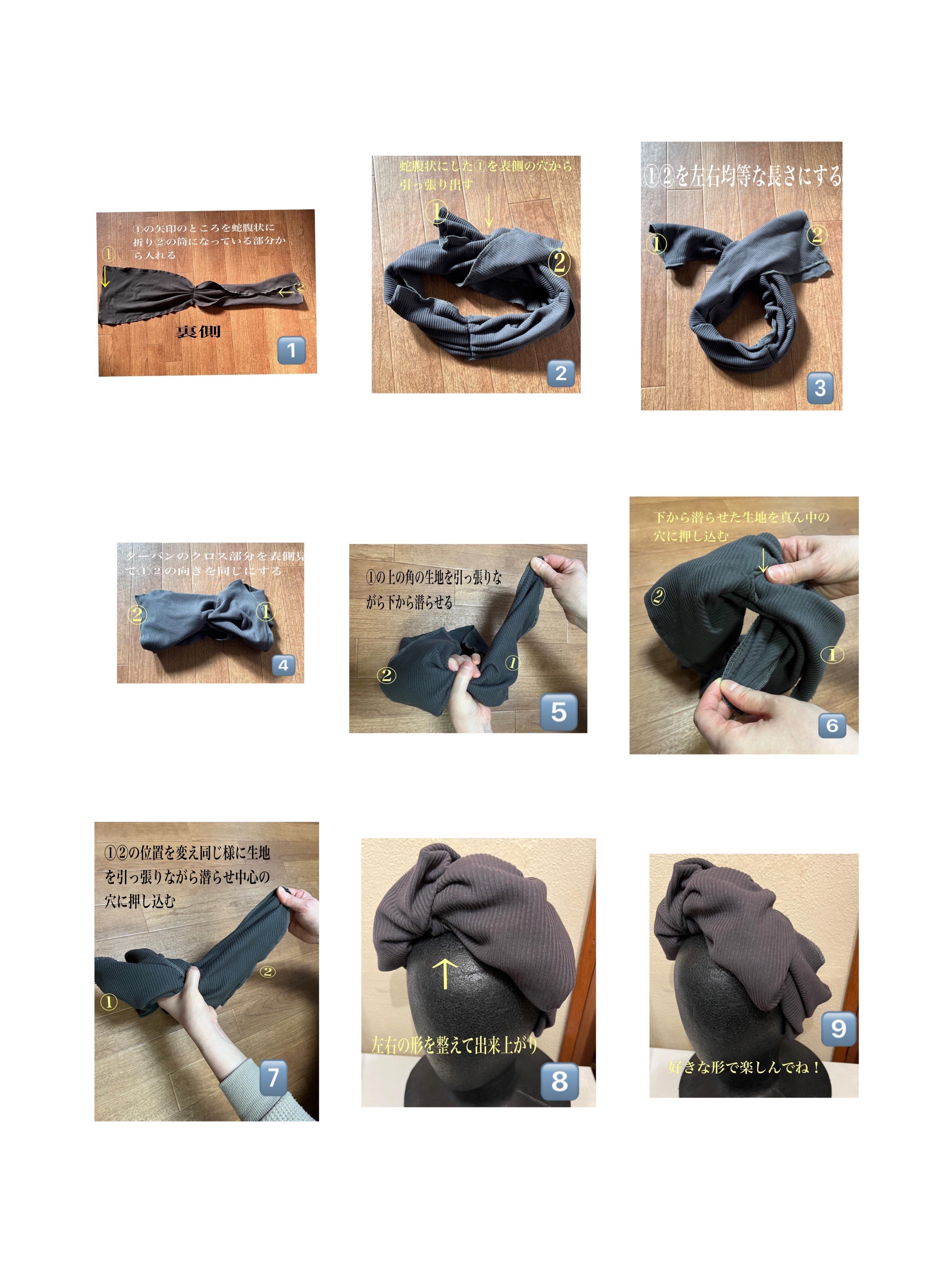 結ばす差し込んで整えるターバンは簡単に装着でき